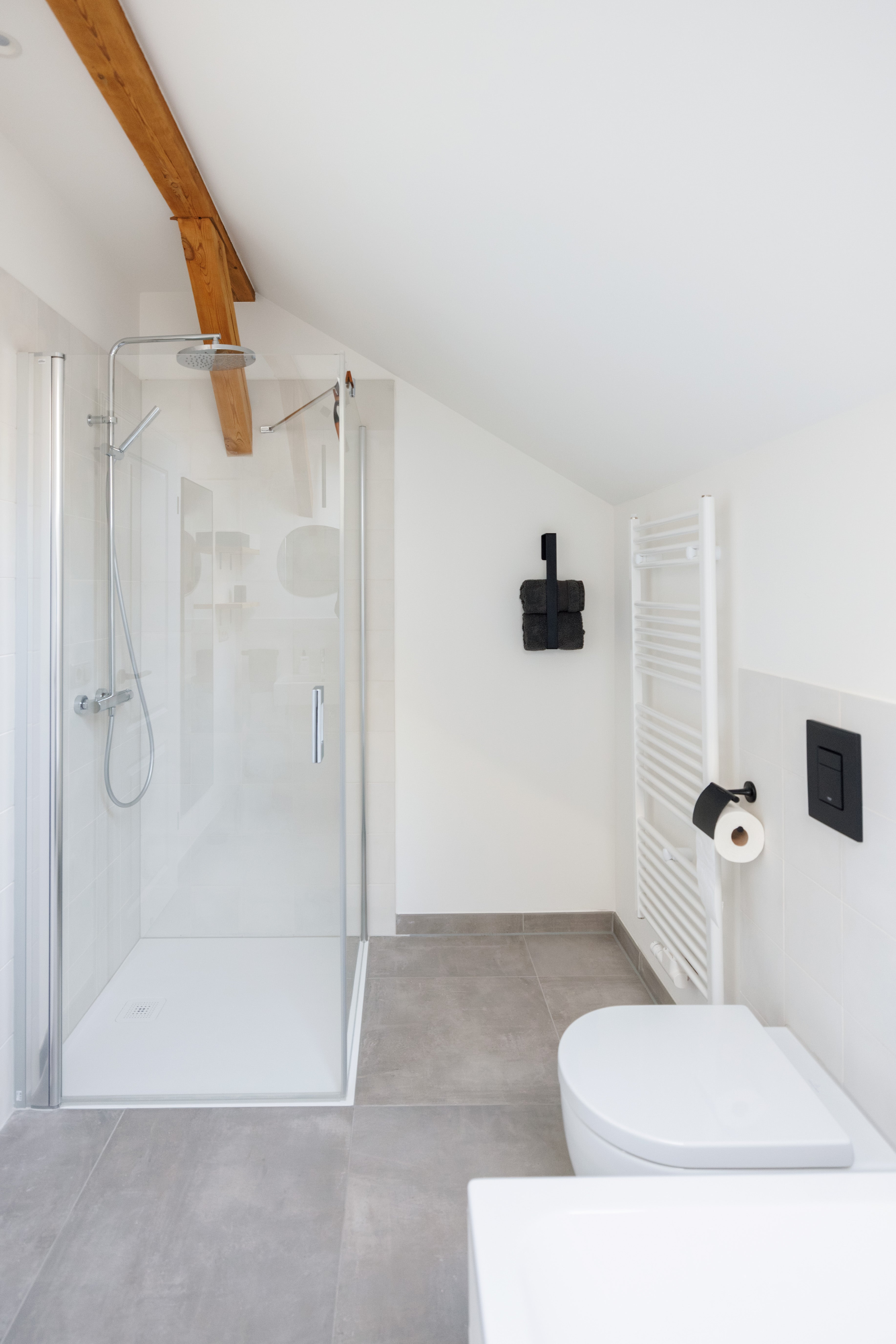 Das Bad verfügt über eine Badewanne und eine ebenerdige Dusche. Vom Fenster aus öffnet sich der Blick über Wiesen und Felder bis hin zum Hebewerk.